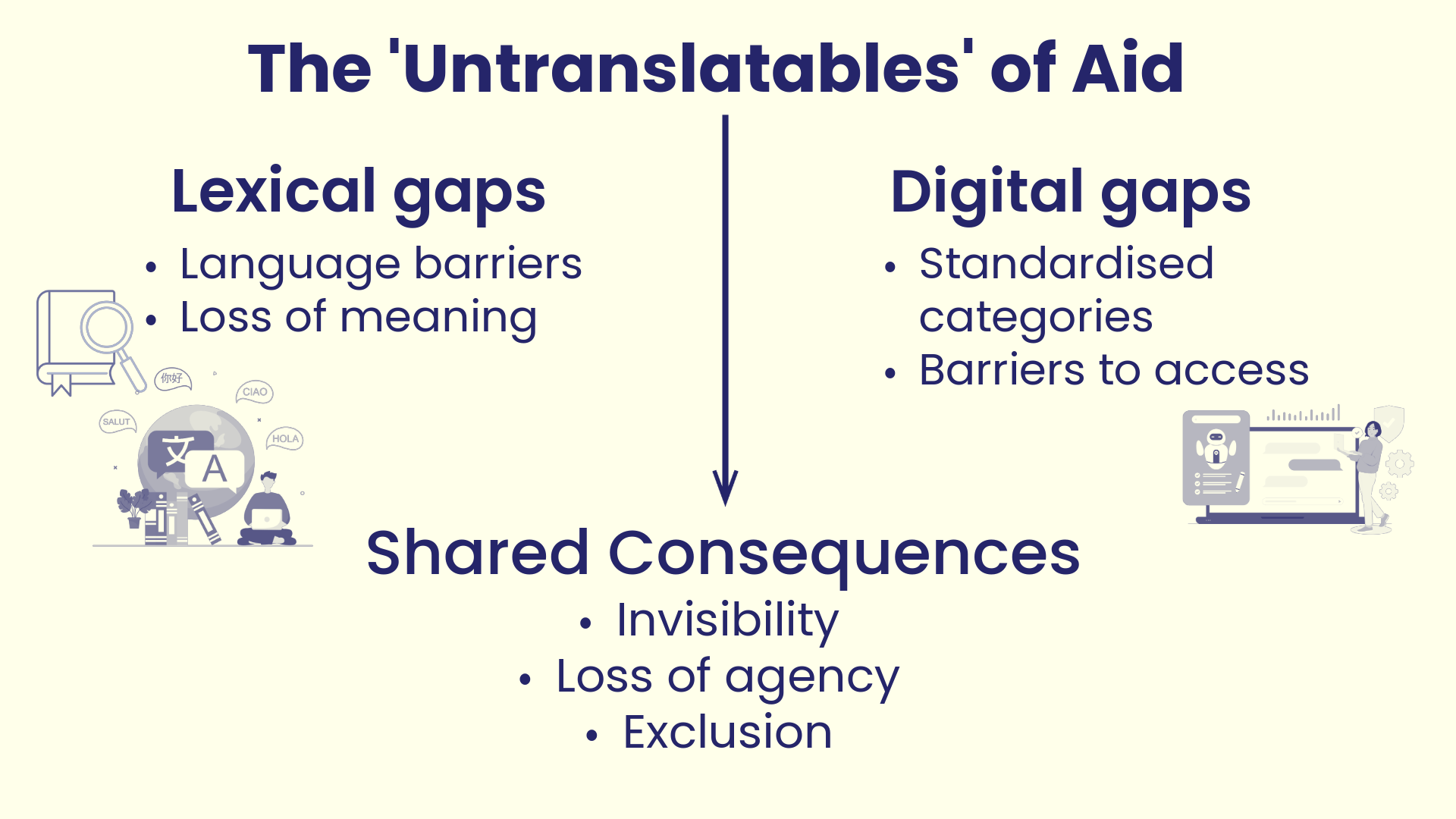 The challenge of untranslatability and “lexical gaps” in humanitarian action goes beyond spoken language. It becomes exacerbated and more consequential in digital aid, for we layer inequalities and inaccessibility of linguistic and digital skills. In this context w might think of a digital language gap as the absence of adequate representation of complex, situated situations of crises and needs with machine-readable systems. It takes time and explanation to communicate cultural nuances and digital systems, which are made to fit values into predefined categories, do not account to process local knowledge and emotions.